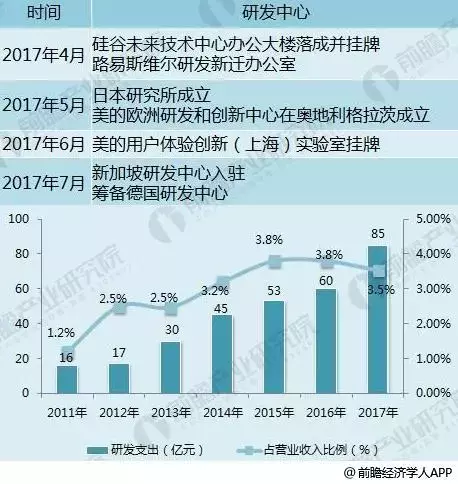 以美的为例,在美国、日本、新加坡设立研发中心。2017年,美的集团研发投入超过85亿元人民币,较2016年的60亿元增长40%,2018年有望一步提升至100亿元人民币。