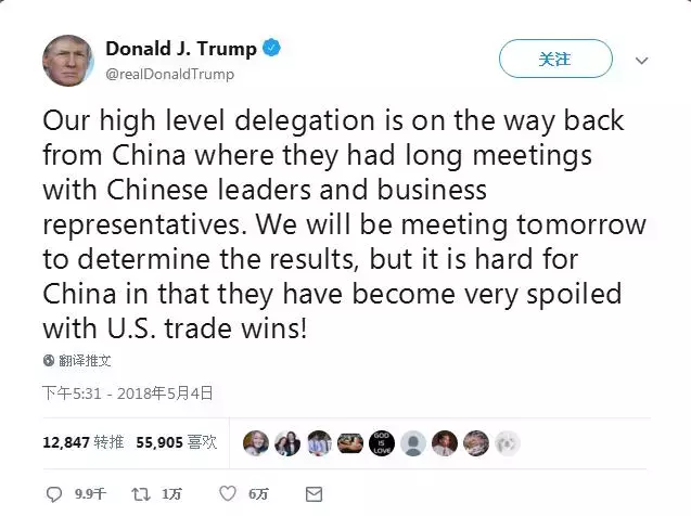 就在今天(美国当地5日,星期六),特朗普破例在周末加班:专门听取美国高级贸易代表团5月3—4日来北京贸易谈判情况的汇报。