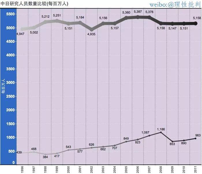 而据不完全统计,在过去的10年里,日本的科研经费平均达到国内生产总值的3%,居发达国家首位。其科研人员数量,则长期稳定在每百万人中五千人左右,而中国则只有日本的五分之一。