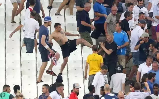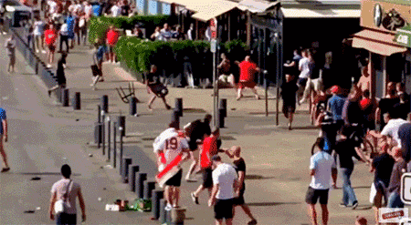 200多个俄罗斯球迷战斗力爆棚,脱了上衣,满球场追着英格兰人跑,从场内一直追到大街上。路边的咖啡厅,被骚乱的球迷冲毁,在场的法国人目瞪口呆:这么多年只听过英格兰流氓欺负人的,没想到今天被人打了!还是1个打5个!