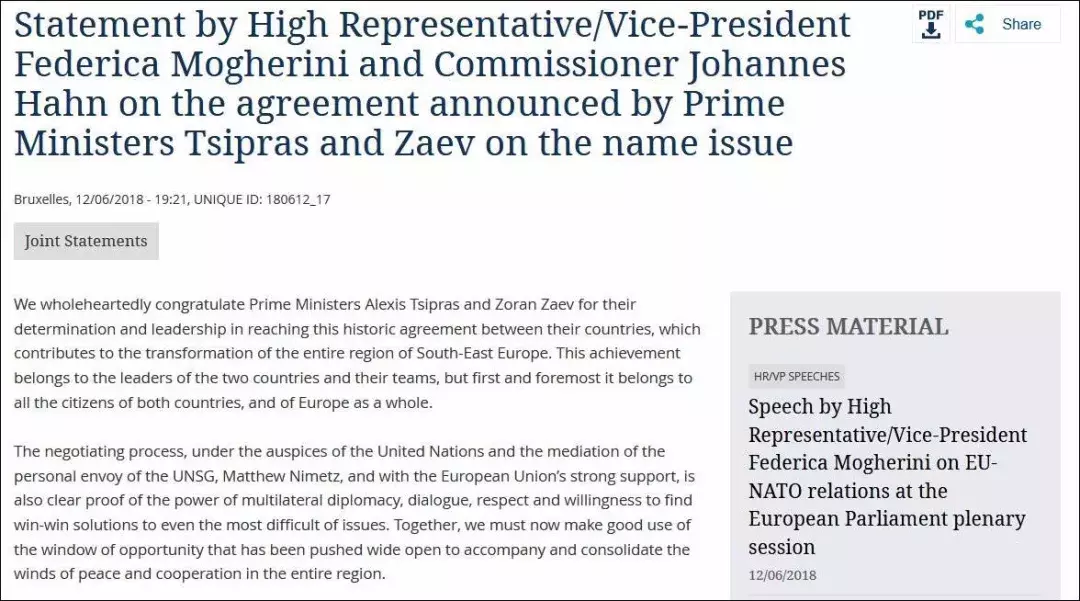 欧盟就更名一事公布两国领导人的声明(图自欧盟官网)