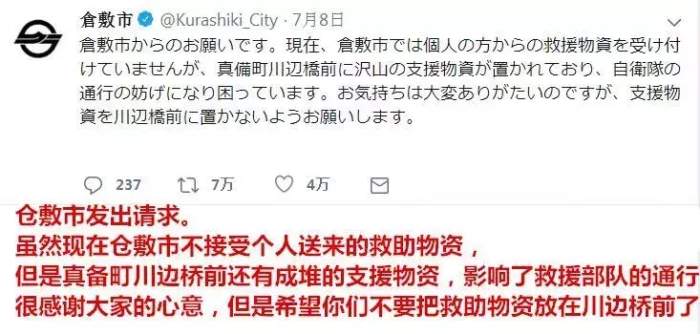 除了这么多送爱心的,还有件事也让受灾当地的政府头疼。7月8日,仓敷市的官方推特就发了一条,原来,许多个人送来的救援物资,堵了救援队伍的路。