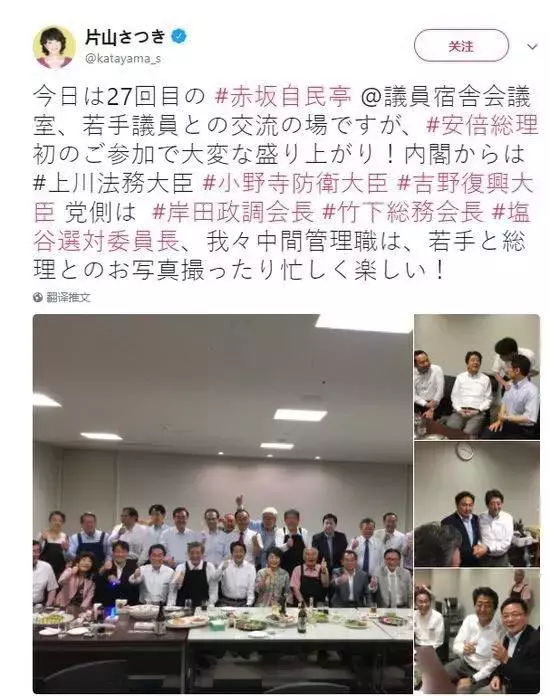 在自民党议员片山发的这条推特上,安倍正与防卫相小野寺五典等人和年轻议员们大开晚宴、交流感情。媒体披露,安倍的这场晚宴,主要目的是跟议员们联络感情,以便赢得9月举行的自民党总裁选举。