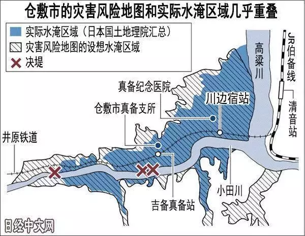 在伤亡惨重的真备町,早在2016年就曾绘制 “洪水泥石流灾害风险地图”。而这次被洪水淹没的区域,与“风险地图”中预测的几乎完全一致。