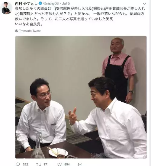 更可怕的是,除了安倍和防卫大臣之外,安倍内阁的灾害应对专家、本来该坚守防灾一线的内阁官房副长官西村康稔,也为了这场酒局而缺席防灾工作。他在推特上兴致勃勃地写道:“许多议员被问是喝安倍总理带来的獭祭酒还是喝岸田政调会长带来的茂鹤酒,虽然大家犹豫了一下但最后还是两瓶都喝了。然后和两位合照。自民党真好啊哈哈。”