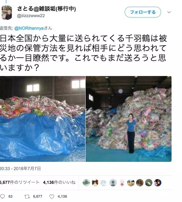 而更让人啼笑皆非的是,好不容易运到灾区的物资,除了急需救命的食物等,还有大量的“精神食粮”——千纸鹤!就连日本网友也看不下去了,纷纷在网上留言呼吁不要再往灾区寄千纸鹤这种没用的东西。
