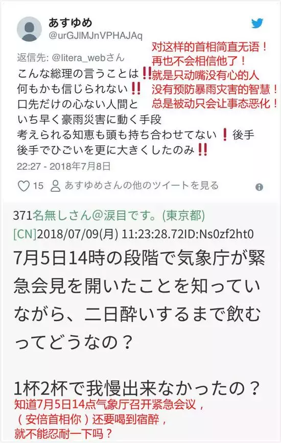 在暴雨洪灾来袭2天后,安倍终于在7日上午召开了有关暴雨对策的第一次会议。直到3天后,安倍才表示“将准备好预备费,迅速推进对灾民的紧急援助。”