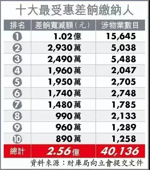 其中,坐拥15,645套房产的房祖宗,获得减税额度高达1.026亿港元(约合人民币8,200万元)。一个人就占据了39%的份额,遥遥领先于第二名!