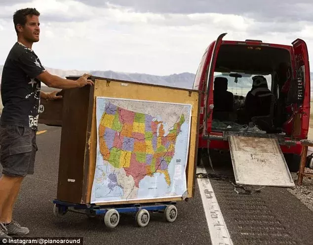 他花光积蓄从网上买了一台二手钢琴,又买了一台二手面包车,车上放一桶汽油,带上爱犬Brando,怀中揣着2美元,迈出了“弹遍世界 ”(piano Around the world)理想之旅的第一步。