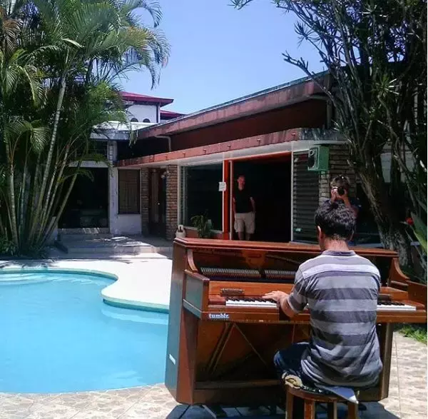 他可以在“火山之国”萨尔瓦多,对着逶迤的群山即兴弹一曲,也可以在哥斯达黎加的湖里尽情玩耍;