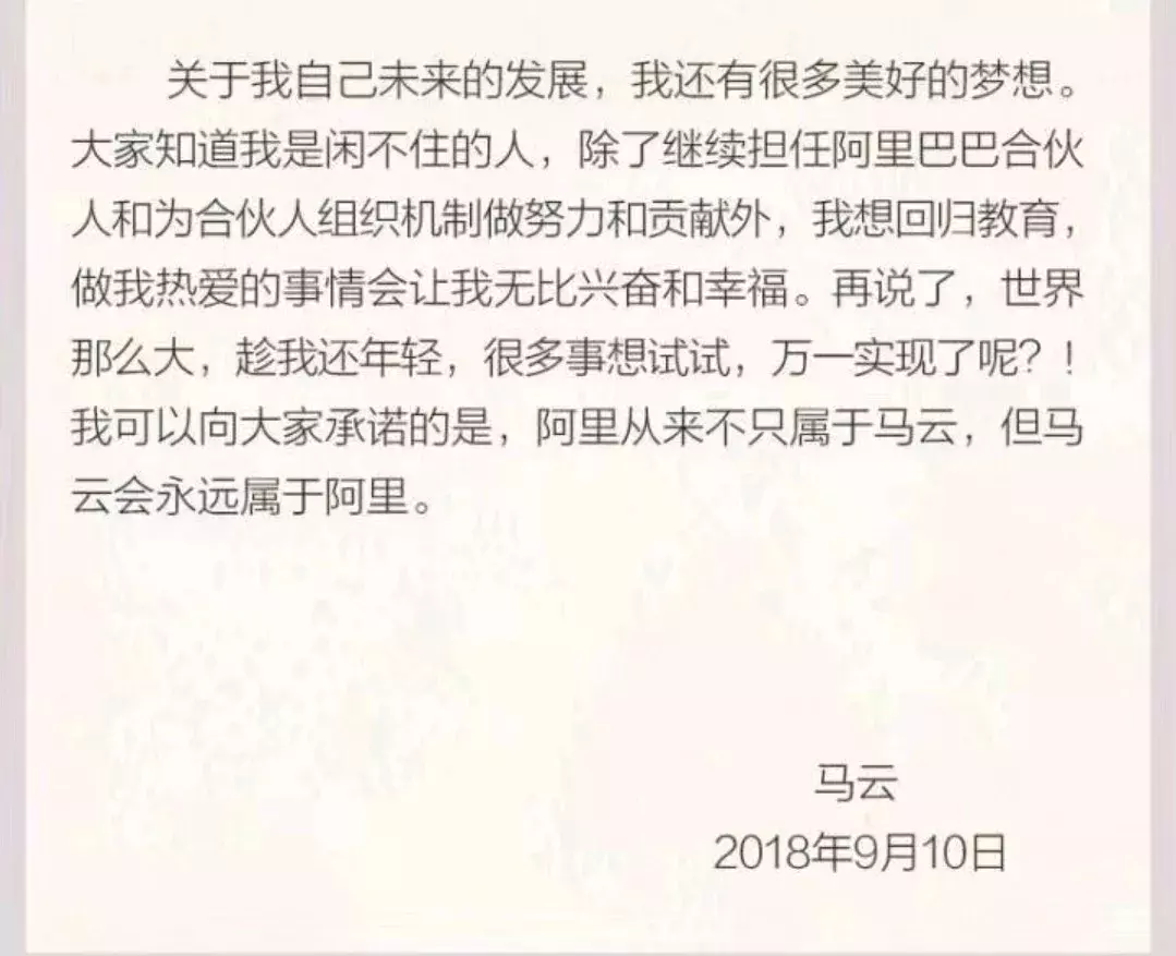马云在教师节那天宣布,一年后卸任,“还年轻”的他将回归初心投身教育事业。