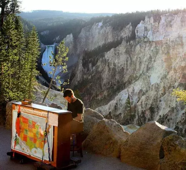 在黄石公园,瀑布与他的琴声遥相呼应;