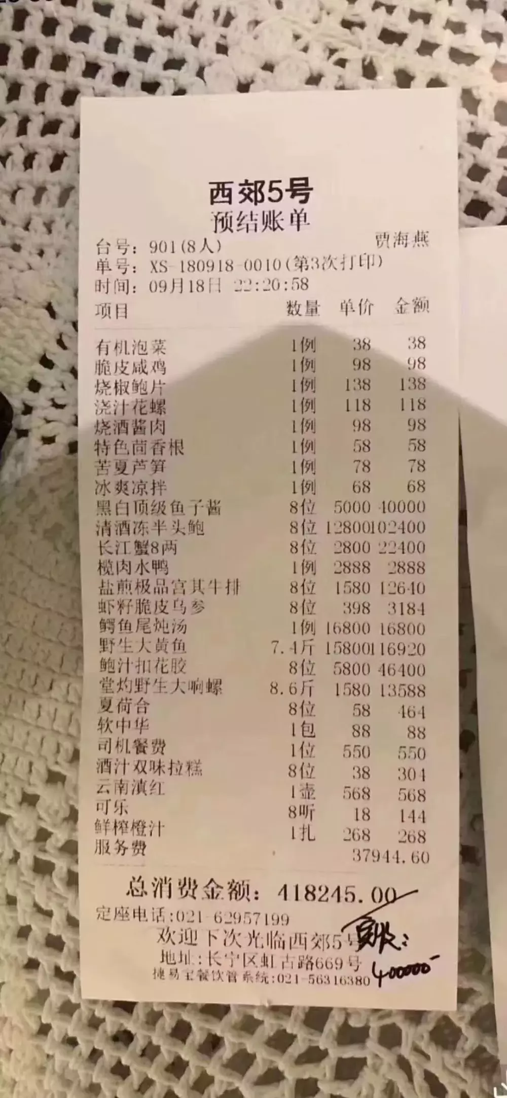 今天,网上疯传一张天价菜单,8个人没喝酒,一共点了20道菜,算上服务费,一顿饭吃了超过40万。