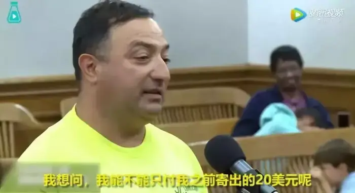法庭上这名身着黄色T恤的男子因为违章停车而收到两张罚单,他原本已经付过第一张罚单的费用,因为警局收到的时间晚了,又给他开了一张,他希望法院能收回第二张罚单。