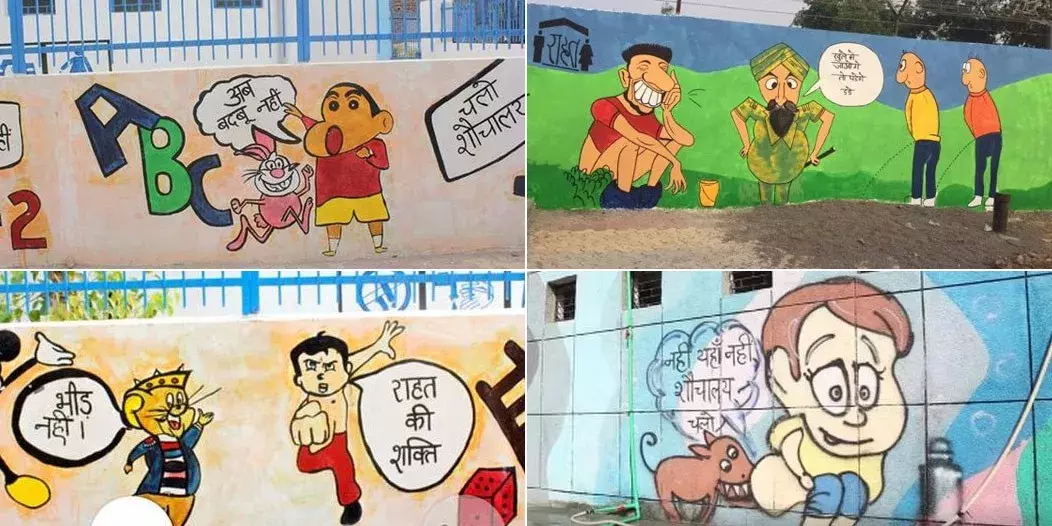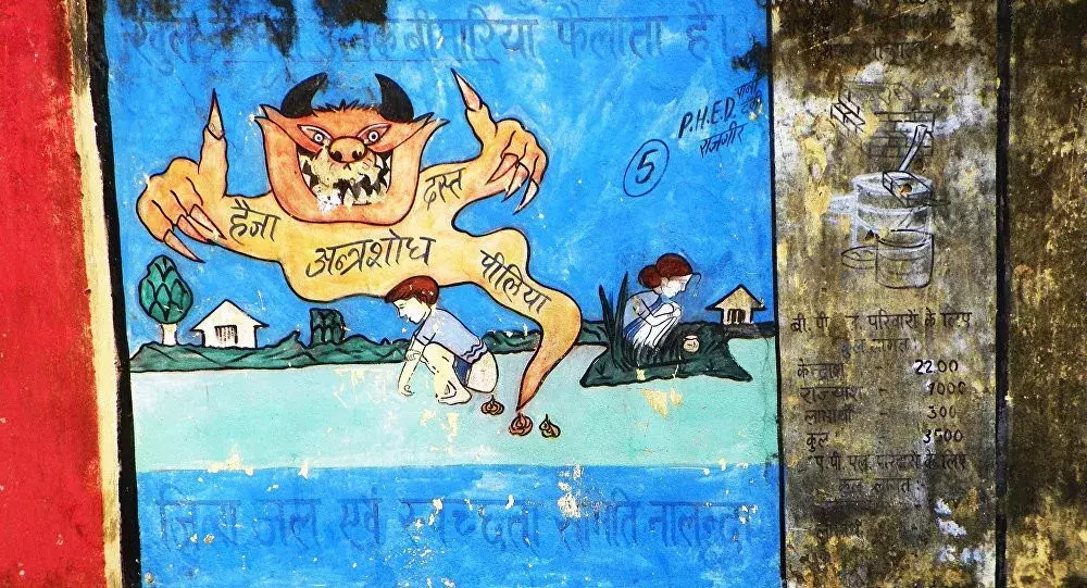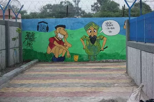 在佛教朝圣名城菩提伽耶,从西郊通往寺庙中心区的主干道上,有一片绵延两三公里的围墙,墙上绘满了反映印度人生活的卡通画。有污水管道向河道排污的场景、有儿童在游乐园嬉戏的情形……当我看到一幅印度人户外如厕的画面时,实在忍俊不禁: