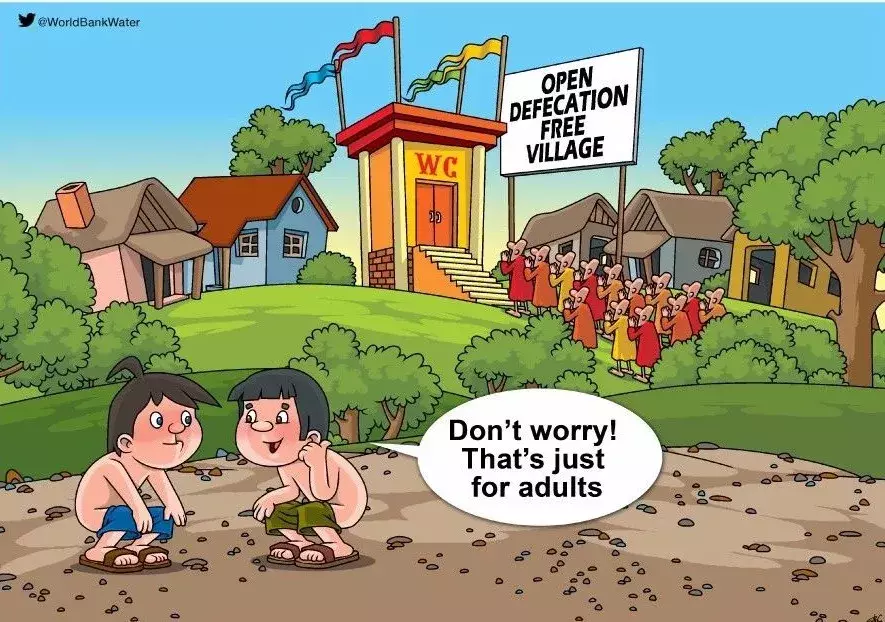 一张小小的漫画反映了国际社会对于这一问题的关注:世界银行持续发布报告,指出孩童户外如厕对于身体和脑部发育的危害。漫画中的两个男孩一边蹲在路边上厕所,一边指着远处村庄里新建的公厕说道:“别担心,那是为大人们建的!”