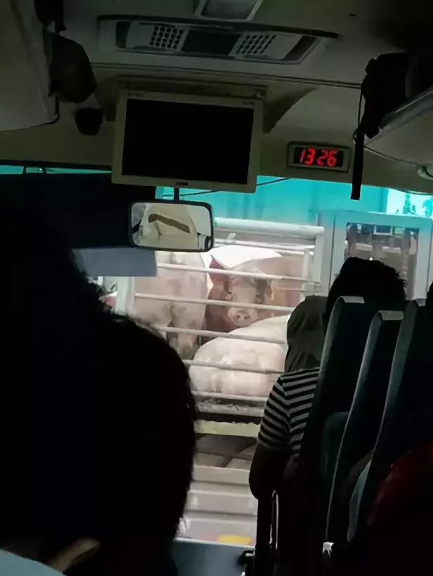 某网友国庆回家,被堵在路上了,于是就这么跟这只猪对峙了半个多小时......