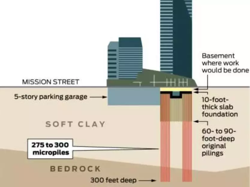 而作为公共机构的“环湾运输管理局”显然不会承认这一说法,回应称:是开发商糟糕的结构设计和地基打得不够深直接导致了楼体下沉。工程师们表示,千禧塔的地基由950个27米深的钢筋混凝土桩固定,但旧金山本身土质松软,真正稳固的基岩,在90米深的地下。