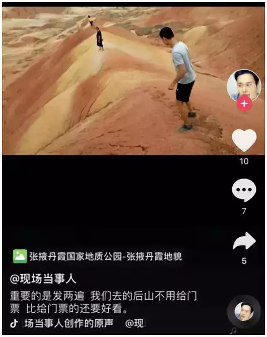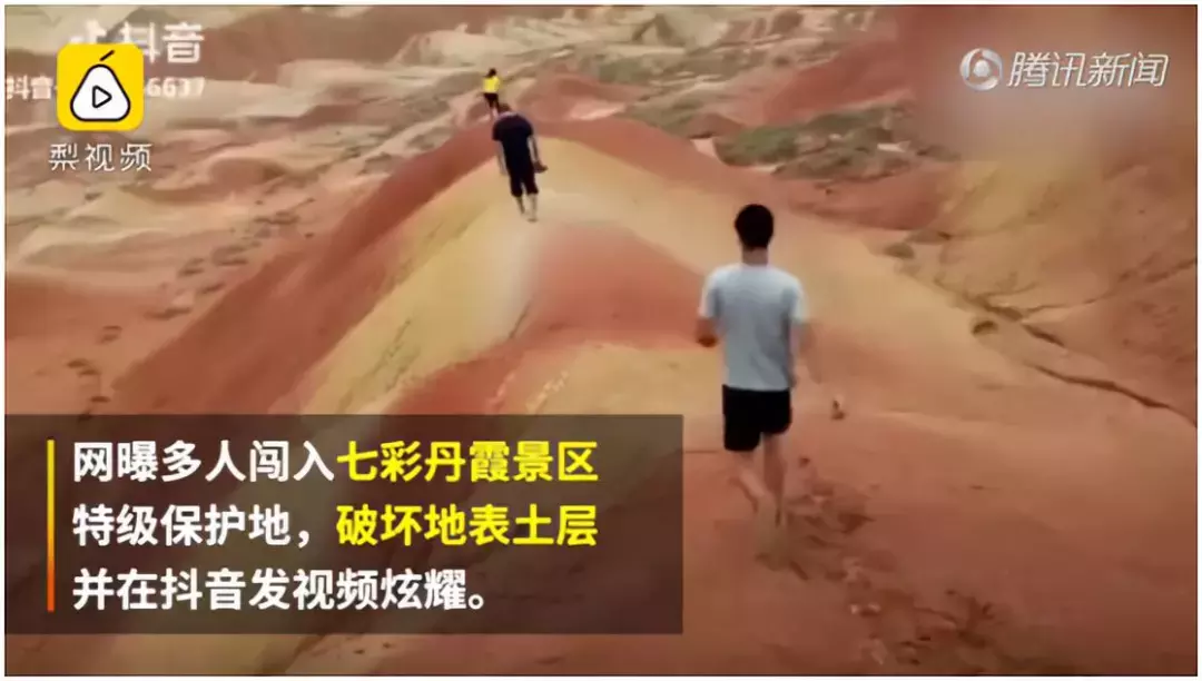 8月26日,抖音上上传了这样一个恶意破坏丹霞地貌视频,视频里的两男一女走在脆弱的丹霞岩体上,使劲儿地踩。