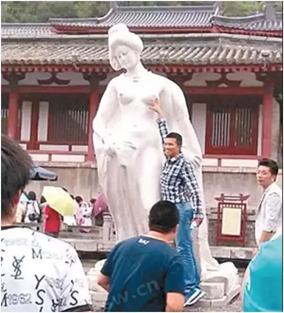 2015年五一期间,在西安华清池景区内,杨贵妃出浴的雕像竟然遭到游客袭胸,工作人员前去制止,却被怒斥,“我花钱进来的,为什么不能摸?”。