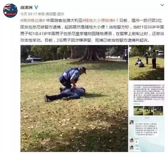 2016年11月2日,在悉尼皇家植物园有两位中国游客随地大小便,被警察制止时,还做出攻击性举动,后被当地警方拘捕。