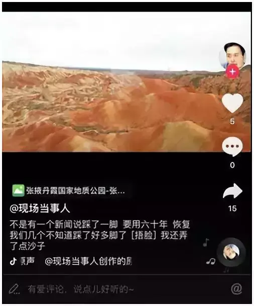 破坏了地质瑰宝,他们不以为耻反以为荣,视频里充斥着“自豪”的宣言,“我破坏了六千年的(原始地貌)。”“不是有一个新闻说踩了一脚,要用六十年恢复,我们几个不知道踩了好多脚,我还弄了沙子。”