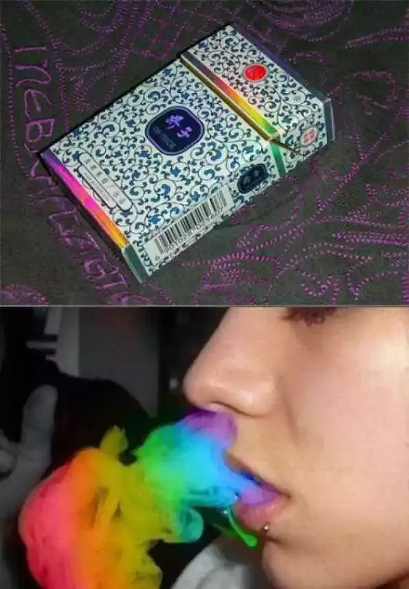 外形和平日的香烟很像,是由纸盒包装的,吸食彩虹烟的时候会产生特殊烟雾。