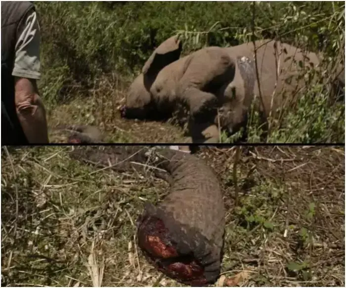 有时候,小象正在母象的身边。却在突然之间,看到母亲倒在地上。一群盗猎者二话不说,割去了母象的头颅,小象眼睁睁地看着母亲被斩首。