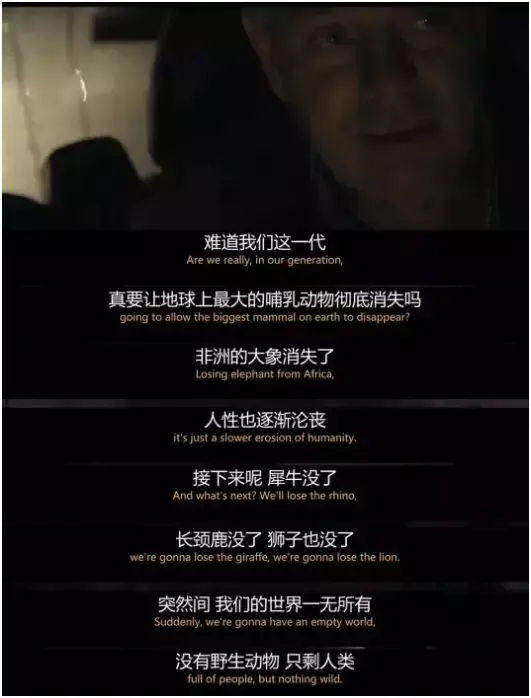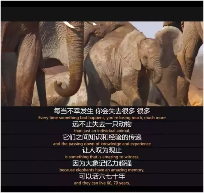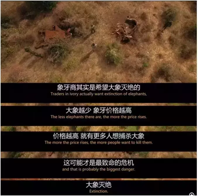 “难道我们这一代真的要让地球上最大的哺乳动物消失吗?非洲的大象消失了,人性也逐渐沦丧。接下来呢?犀牛没了,长颈鹿没了,狮子也没了。突然之间,我们的世界一无所有,没有野生动物,只有人类。”