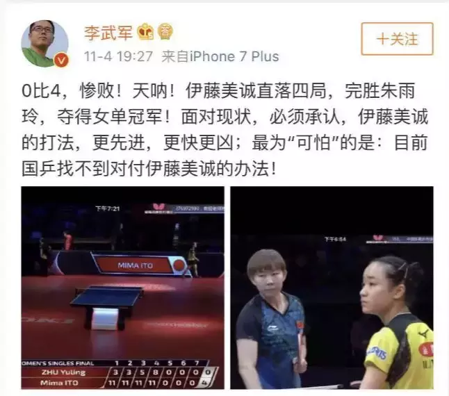 看完这次比赛后,著名记者李武军从专业角度表达了自己的观点:“面对现状,必须承认,伊藤美诚的打法,更先进,更快更凶。最可怕的是,目前国乒找不到对付伊藤美诚的办法。”