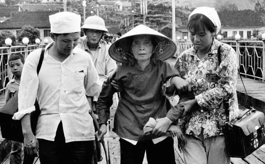 1978年5月27日,云南河口,我方医务人员搀扶被越南驱赶回国的华侨老人踏上祖国土地。
