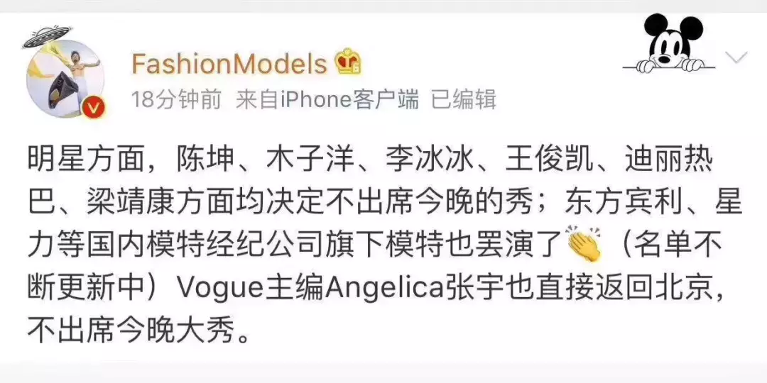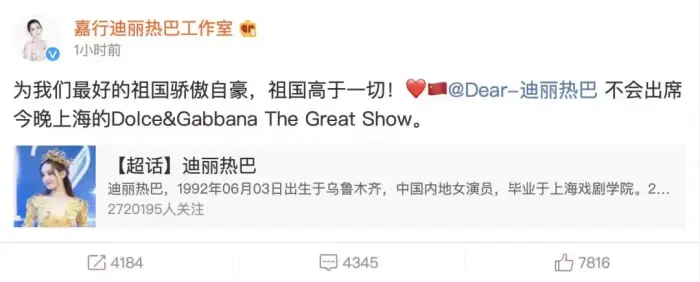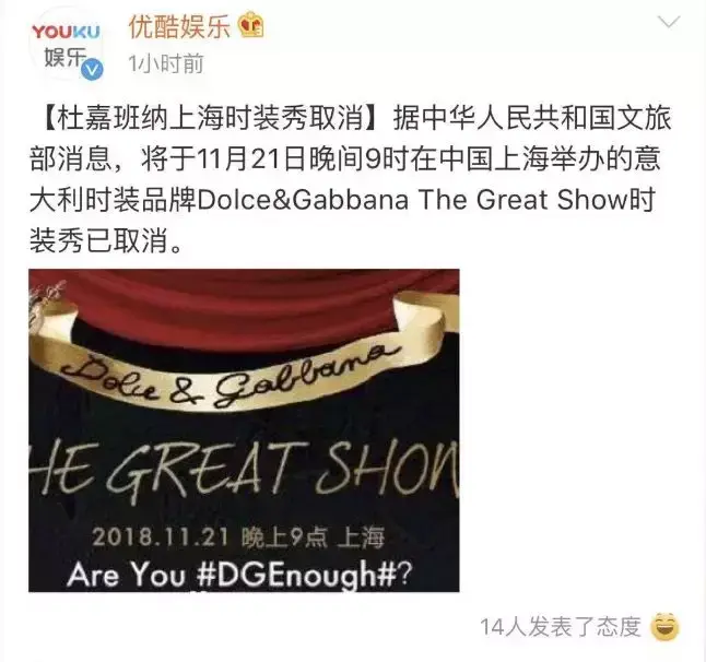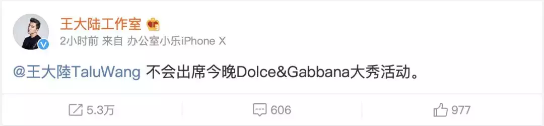 截止发稿前,章子怡、陈坤、黄晓明、李冰冰、王俊凯、迪丽热巴、范丞丞、木子洋、唐艺昕、火箭少女101等中国明星均表示不再出席今晚的D&G秀,东方宾利、星力等国内模特经纪公司旗下的模特们也罢演了。
