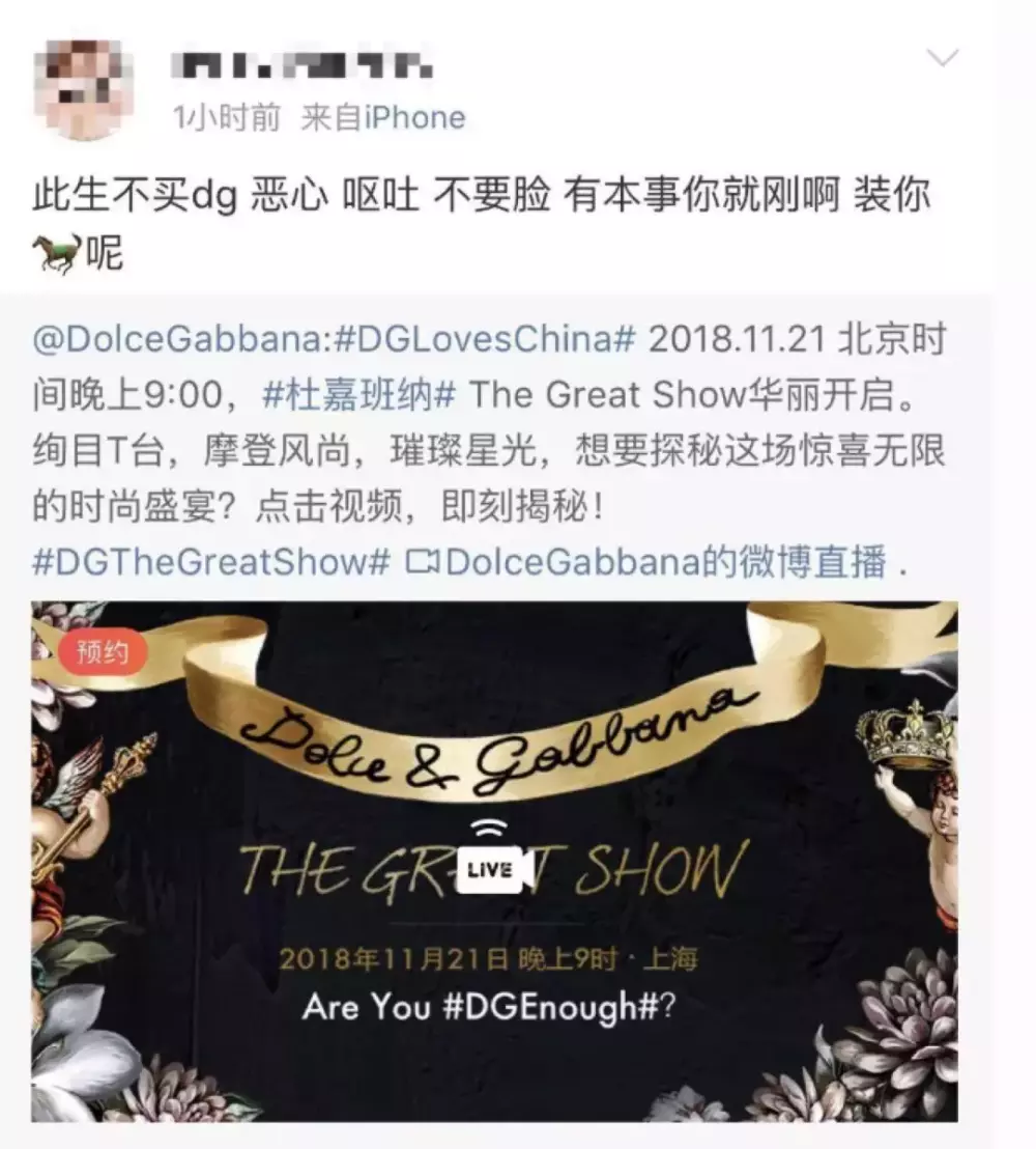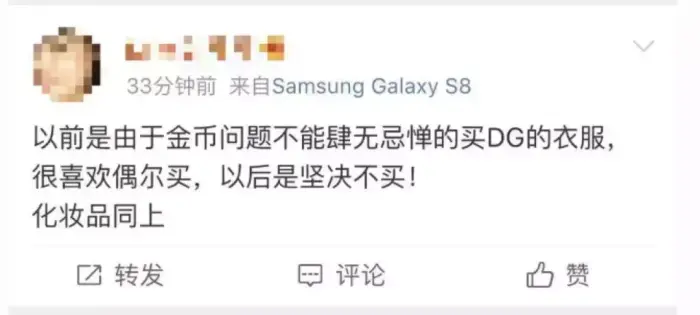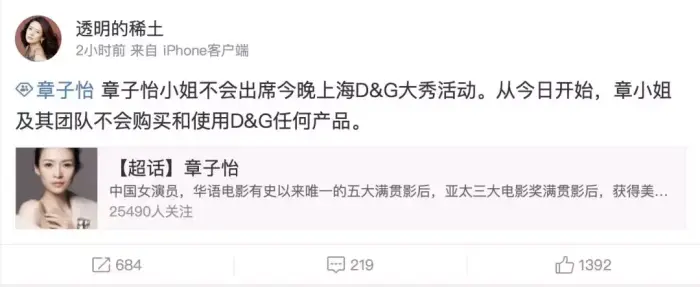 这么一系列不怕死的操作,彻底激怒了中国人,在得知D&G如此傲慢,对中国人无理谩骂后,中国明星们纷纷发表声明,称不再出席D&G秀。
