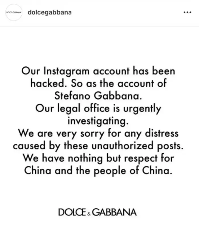 为了避免事态继续发展,激发起更大的愤怒,D&G设计师立马发ins澄清:“我的ins账号被盗了。我的律师正在处理这件事,我爱中国和中国文化,对于发生的事我感到非常抱歉。”