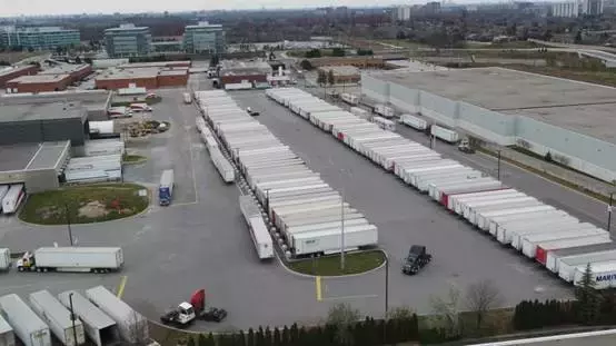在加拿大邮政提供的这张照片中,周五在安大略省米西索加的一个配送中心站满了装满未交付包裹的卡车。(加拿大邮报)