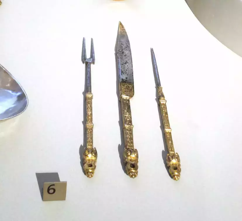 洛阳的一个战国墓里,出土了50多件多铜刀铜叉,甘肃酒泉出土过东汉铜餐叉,广东出土过东晋铁餐叉,甘肃漳县出土过元代的餐叉餐刀......
