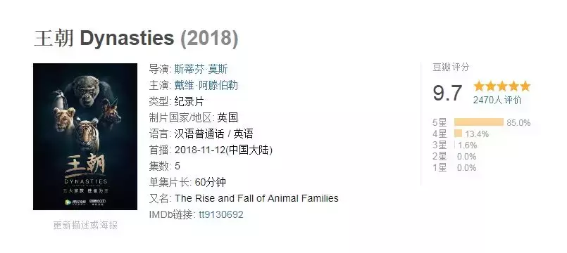 而BBC最新自然纪录片《王朝》(Dynasties),刚一上映就拿下豆瓣评分9.7的高分!