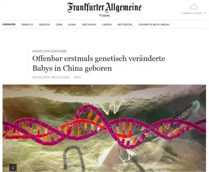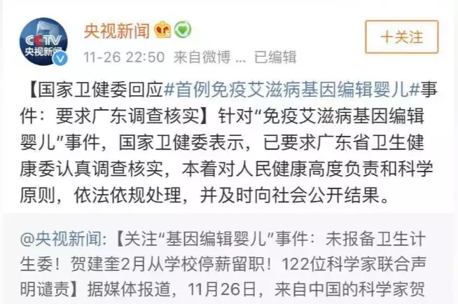 人民日报:《最新!“基因编辑婴儿”事件震惊社会,官方启动伦理调查》
