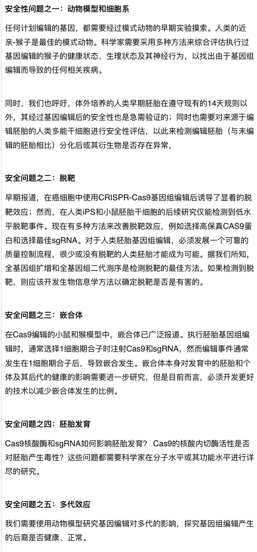 早在2017年2月初,贺建奎参加“伯克利基因编辑研讨会”时,做过这么一个报告:《人类胚胎基因编辑安全性》,在这份报告中,他详细地阐述了基因编辑存在的五大问题。