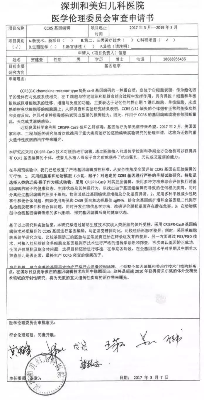 可就在做完这个报告后,回国没多久,他就向深圳和美妇儿科医院提出了CCR5基因编辑的申请。从目前网传的资料可以看出,这一申请得到了医学伦理委员会的批准。