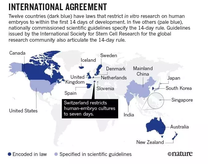 14天规则:科学家只能在不满14天的胚胎上进行实验。14天之前的人类胚胎还未分化出神经等结构,尚不具备人的特征,因此不涉及伦理问题。
