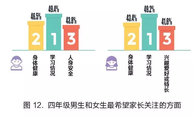四年级男生希望家长关注自己的人身安全,而女生更希望家长关注自己的兴趣爱好和特长。