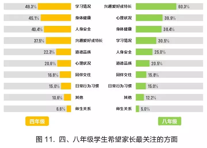 可孩子最希望家长关注的则有意思了,四年级和八年级学生差别很大。