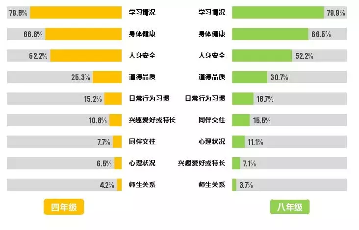 数据显示,家长最关注孩子的是学习情况、身体健康、人身安全,而对孩子的道德品质、日常行为习惯、兴趣爱好或特长、心理状况关注很少。