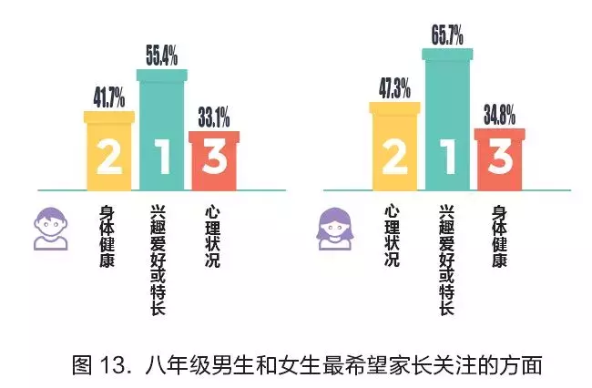 相对而言,男生更注重独立、对父母的依赖更少,而女生情感更细腻、内心更敏感、更愿意向父母表达自己的内心,所以女生比男生更希望家长关注自己的心理状况。