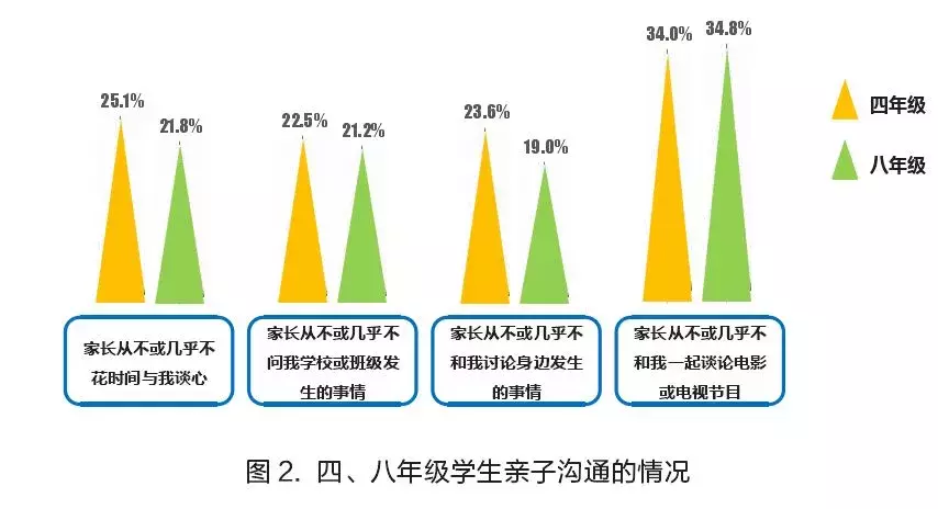 与四年级相比,八年级学生表面上看,青春期的孩子对家长的依赖明显减少、渴望独立,但实际上家庭在他们心目中的地位反而变得很重要。