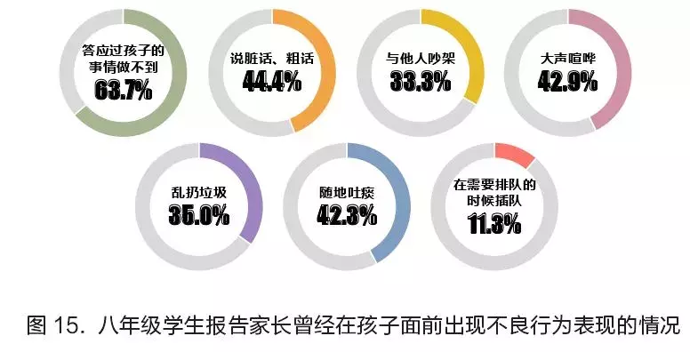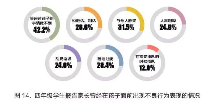 但是在实际调查中,家长并不能很好地以身作则,在孩子面前有不良的行为,例如答应事情做不到,说脏话粗话,与他人吵架、大声喧哗、扔垃圾、吐痰、插队等。