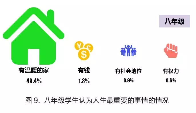 四、八年级学生认为人生最重要的事情排名第一位的均为“有温暖的家”(39.3%、49.4%),且比例远高于“有钱”、“有社会地位”、“有权力”。