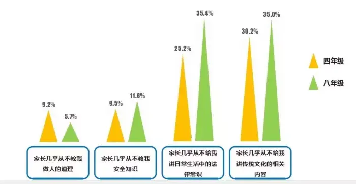 有的孩子认为,家长没有教自己“做人的道理”、“安全知识”、“法律常识”、“传统文化”。