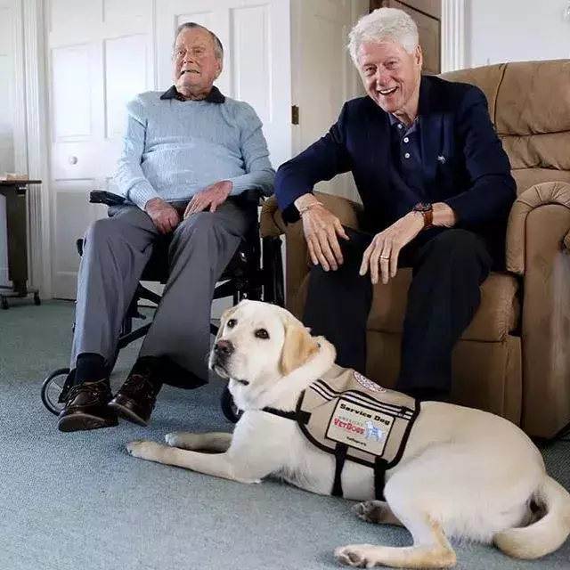 6月25日,老布什的官方推特上发布了一张老布什、克林顿和萨利的合影。并附文:“热烈欢迎我们家的新成员萨利,这是一只来自美国服务犬机构(America’s VetDogs,非营利组织,专门为有需要的退伍军人、现役军人和残疾人士提供免费的服务犬)的漂亮、训练有素的拉布拉多。”